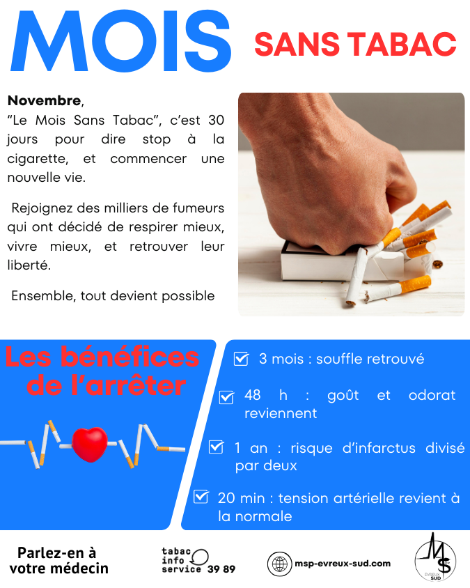 🚭 En novembre, on arrête ensemble !Le « MoisSansTabac », c’est 30 jours pour dire stop à la cigarette et commencer une nouvelle vie.Chaque jour sans tabac, c’est une victoire pour votre santé, votre énergie et votre liberté 🌞 Besoin d’un coup de pouce ?👉 Consultez votre médecin👉 Appelez le 39 89👉 Rendez-vous sur « tabac-info-service.fr » Ensemble, on […]
